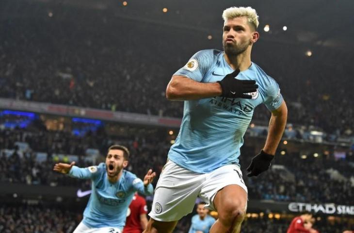 Selebrasi Sergio Aguero setelah ciptakan gol ke gawang Liverpool, Jumat (04/01/2019). (PAUL ELLIS/AFP)