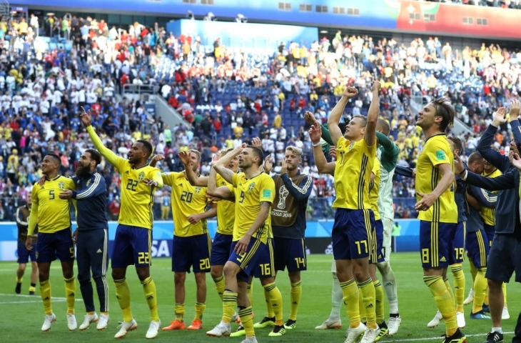 Selebrasi para pemain Swedia usai tumbangkan Swiss 1-0 di babak 16 besar Piala Dunia 2018.