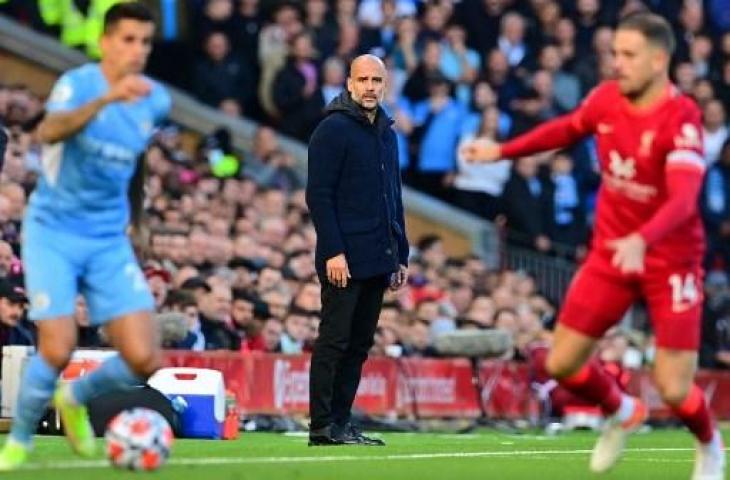 Pelatih Manchester City, Pep Guardiola saat pertandingan antara Liverpool vs Manchester City di Anfield pada lanjutan Liga Inggris, Minggu (3/10/2021). (Paul ELLIS / AFP)
