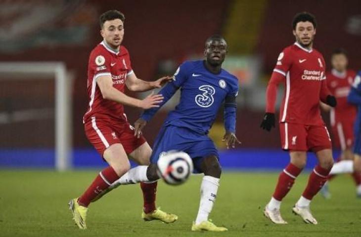Aksi duel Diogo Jota dan N’Golo Kante saat laga Liverpool vs Chelsea. (AFP)