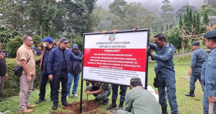 Pantauan detikcom, petugas Kementerian Kehutanan (Kemenhut) bersama Kementerian ATR/BPN mulai melakukan penindakan terhadap bangunan vila yang diduga melanggar. Vila pertama yang ditindak yakni Villa Forest Hill yang berada di Desa Tugu Utara, Kecamatan Cisarua, Kabupaten Bogor.